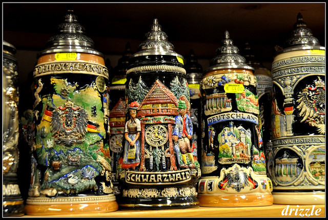 德國傳統啤酒杯,陶瓷製加上錫蓋,杯身有鮮艷的彩繪圖案